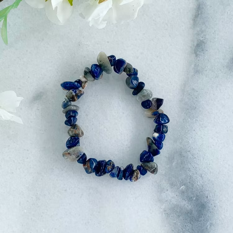 Handgjort armband med chips av sodalit. Ca 18-19cm. Sodalit är en kristall som hjälper dig med ditt självförtroende samt påminner dig om ditt egna värde.