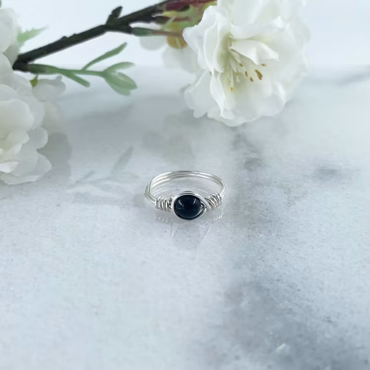 Ring som är handgjord av mig. Pärlan är gjord av obsidian. Obsidian är en kristall som sägs kunna förstärka vårt fokus. Chipsen varierar i storlek och form.